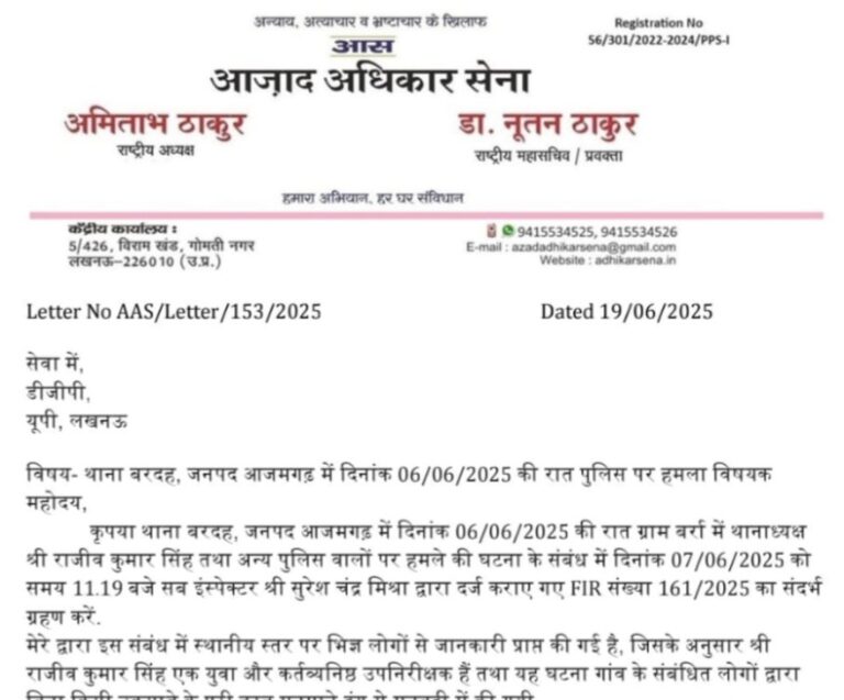 आजमगढ़। आजाद अधिकार सेना के राष्ट्रीय अध्यक्ष अमिताभ ठाकुर ने उत्तर प्रदेश के डीजीपी को पत्र लिखकर आजमगढ़ के थाना...