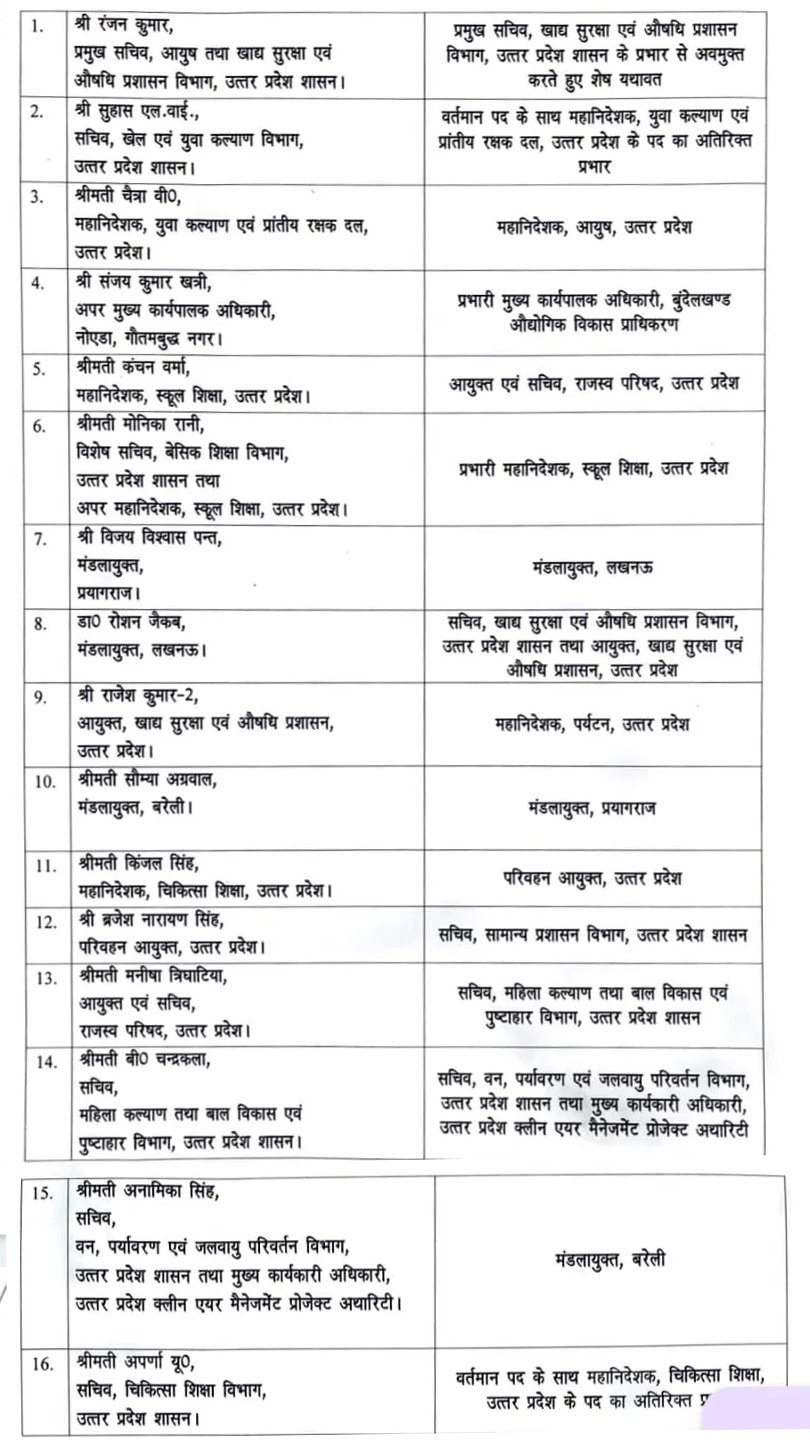 प्रयागराज के मंडलायुक्त विजय विश्वास पंत को लखनऊ का मंडलायुक्त, बरेली की मंडलायुक्त सौम्या अग्रवाल को प्रयागराज का मंडलायुक्त और सचिव वन, पर्यावरण एवं जलवायु परिवर्तन विभाग व सीईओ यूपी क्लीन एयर मैनेजमेंट प्रोजेक्ट अथॉरिटी अनामिका सिंह को बरेली का मंडलायुक्त बनाया गया है। राजेश कुमार द्वितीय आयुक्त खाद्य सुरक्षा एवं औषधि प्रशासन को महानिदेशक पर्यटन, किंजल सिंह महानिदेशक चिकित्सा शिक्षा को परिवहन आयुक्त, ब्रजेश नारायण सिंह परिवहन आयुक्त को सचिव सामान्य प्रशासन विभाग के पद की जिम्मेदारी मिली है। आयुक्त एवं सचिव राजस्व परिषद मनीषा त्रिघाटिया को सचिव महिला कल्याण एवं बाल विकास एवं पुष्टाहार विभाग, बी. चंद्रकला सचिव महिला कल्याण तथा बाल विकास एवं पुष्टाहार विभाग को सचिव वन, पर्यावरण एवं जलवायु परिवर्तन विभाग व सीईओ यूपी क्लीन एयर मैनेजमेंट प्रोजेक्ट अथॉरिटी के पद पर तैनाती दी गई है। सचिव चिकित्सा शिक्षा अपर्णा यू को वर्तमान पद के साथ महानिदेशक चिकित्सा शिक्षा के पद का अतिरिक्त प्रभार दिया गया है।