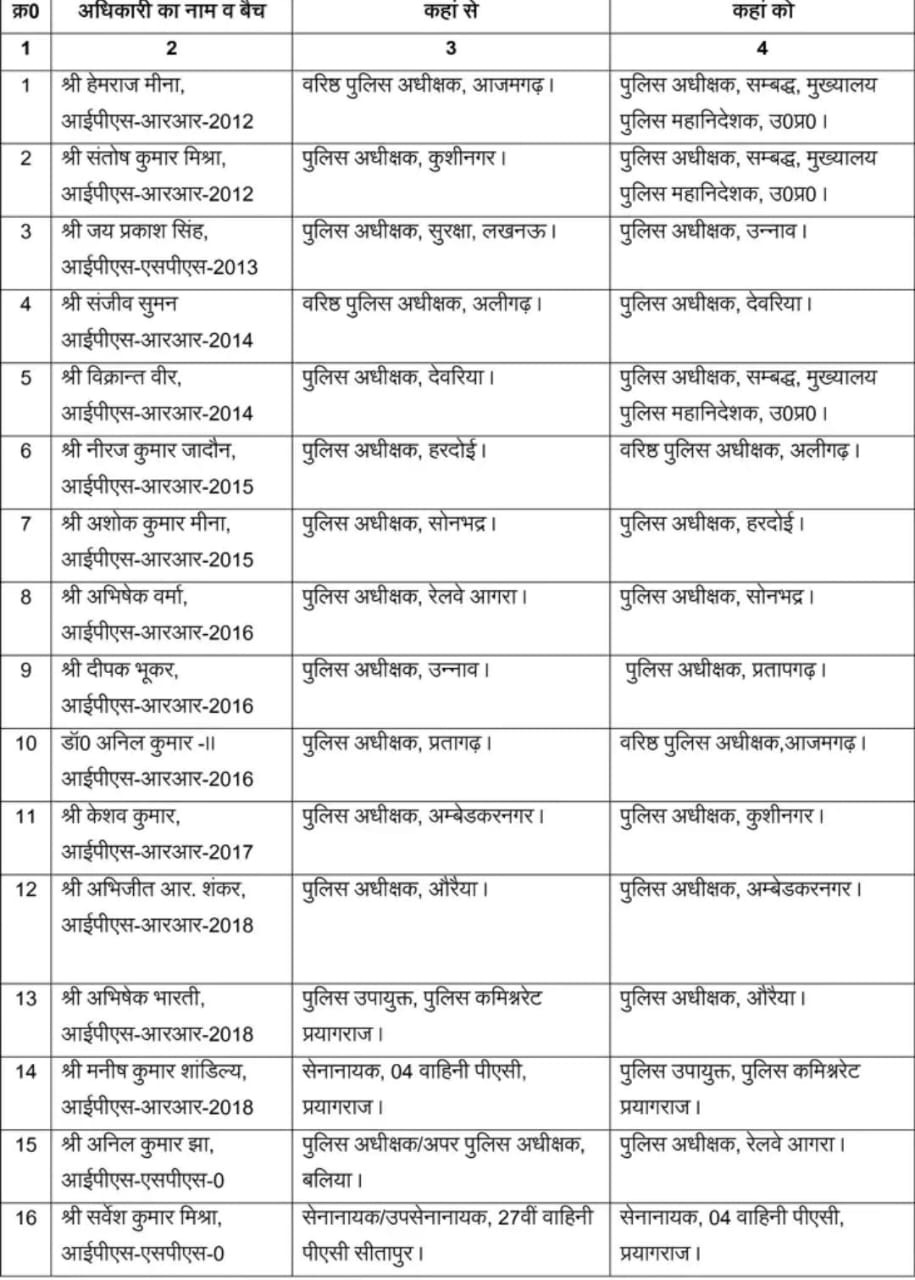 लखनऊ। उत्तर प्रदेश सरकार ने मंगलवार देर रात 16 IPS अफसरों का तबादला कर दिया। इनमें 10 जिलों के पुलिस कप्तान भी शामिल हैं। आजमगढ़ के SSP हेमराज मीना, कुशीनगर के SP संतोष मिश्रा और देवरिया के SP विक्रांत वीर को पुलिस मुख्यालय से अटैच किया गया है। हरदोई के SP नीरज जादौन को अलीगढ़ का नया SP बनाया गया है, जबकि सोनभद्र के SP अशोक कुमार मीणा को हरदोई की कमान सौंपी गई है। अलीगढ़ के SP संजीव सुमन को देवरिया भेजा गया है। उन्नाव के SP पद की जिम्मेदारी जयप्रकाश सिंह को दी गई है। डॉ अनिल कुमार द्वितीय पुलिस अधीक्षक प्रतापगढ़ को आजमगढ़ के नए एसपी पद की जिम्मेदारी सौंपी गई है।