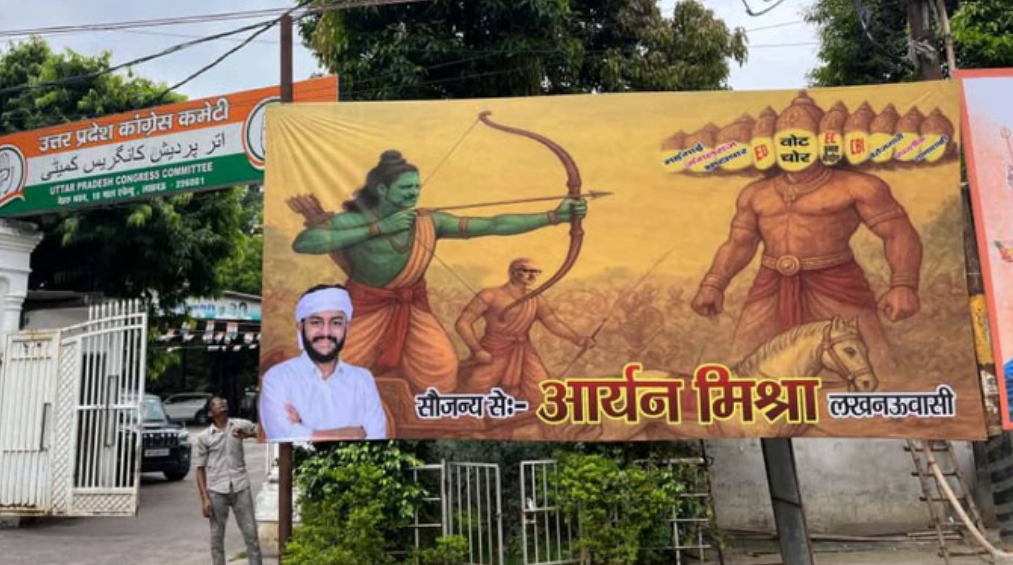 लखनऊ। उत्तर प्रदेश में भाजपा और विपक्ष के बीच होर्डिंग वार जारी है। शुक्रवार को राजधानी लखनऊ में एक बार फिर एक होर्डिंग सामने आई है। यह होर्डिंग कांग्रेस कार्यालय के बाहर लगाई गई है। इसमें राहुल गांधी को राम और सरकार को रावण दिखाया गया है। यूपी की राजनीति में होर्डिंग और पोस्टर से पार्टियां एक-दूसरे पर निशाना साधते नजर आती हैं। अब दशहरा पर्व पर कांग्रेस कार्यालय के बाहर एक होर्डिंग लगाई गई है। इसमें राहुल गांधी को श्रीराम के रूप में दिखाया गया है। उनके हाथ में एक धनुष है, जिसके तरकस में बाण हैं। जैसे अभी संधान होने वाला है। सामने रावण की तस्वीर है। रावण के रूप में परोक्ष रूप से केंद्र सरकार को दिखाया गया है। इनके दस सिरों में अलग-अलग विभागों के नाम लिखे गए हैं। मुख्य चेहरे पर ‘वोट चोर’ लिखा गया है। तस्वीर को लोग अपने-अपने नजरिए से देख रहे हैं। माल एवेन्यू स्थित, कांग्रेस कार्यालय के बाहर लगी यह होर्डिंग एनएसयूआई के प्रदेश उपाध्यक्ष आर्यन मिश्रा द्वारा लाई गई है। इस तस्वीर में कांग्रेस के उत्तर प्रदेश के प्रदेश अध्यक्ष अजय राय को लक्ष्मण के रूप में दिखाया गया है।