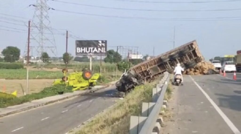 ट्रक की कंपाइन मशीन से जोरदार टक्कर; एक मौत और चार घायल