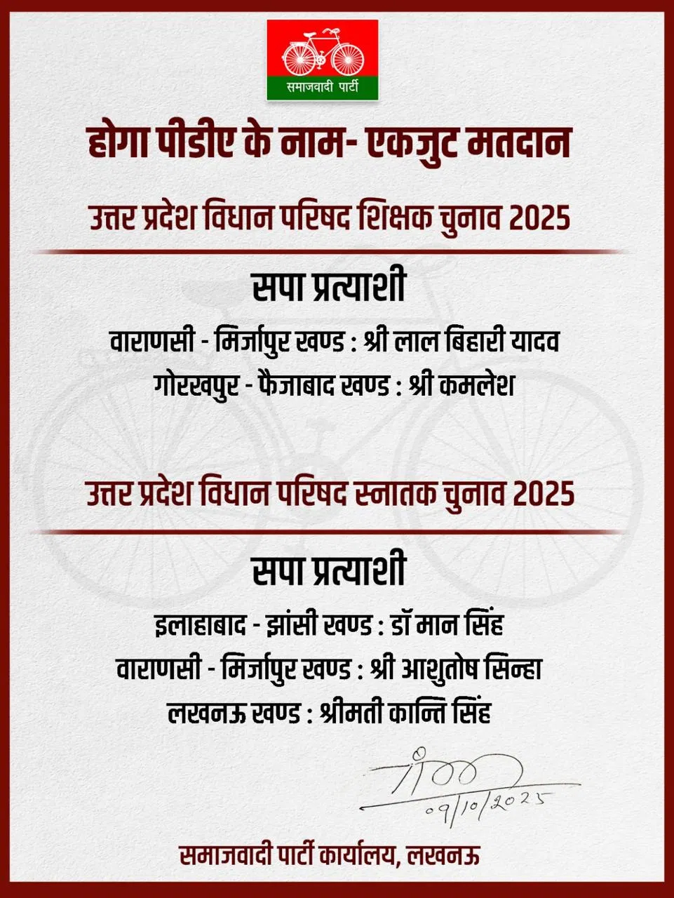 विधान परिषद चुनाव के लिए सपा ने घोषित किए प्रत्याशी, लखनऊ से इन्हें बनाया प्रत्याशी