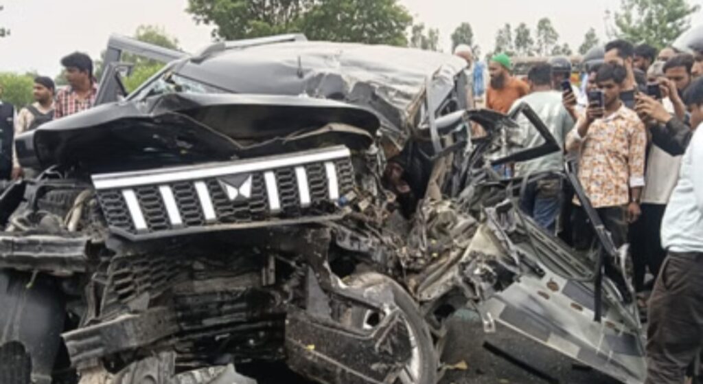 बाइक को टक्कर मारकर खड़े टैंकर से टकराई एसयूवी कार, पांच लोगों की मौत, तीन घायल