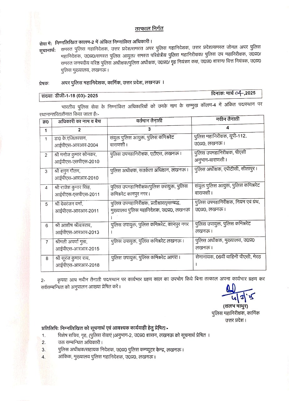 लखनऊ। डीजीपी मुख्यालय ने मंगलवार को 8 आईपीएस अधिकारियों का तबादला कर दिया, जिनमें बलिया वसूली कांड में हटाए जाने के बाद प्रतीक्षारत चल रहे एसपी देवरंजन वर्मा भी शामिल हैं। उन्हें डीआईजी नियम एवं ग्रंथ बनाया गया है। अन्य तबादलों में वाराणसी के संयुक्त पुलिस आयुक्त डॉ. के. एलिजरसन को यूपी 112 भेजा गया है। इसके अलावा एटीएस के डीआईजी मनोज सोनकर को पीएसी के वाराणसी अनुभाग भेजा गया है। सतर्कता अधिष्ठान में तैनात शगुन गौतम को एपीटीसी, सीतापुर का एसपी बनाया गया है। कानपुर नगर में पुलिस उपायुक्त राजेश कुमार सिंह को वाराणसी में संयुक्त पुलिस आयुक्त बनाया गया है। कानपुर कमिश्नरेट में पुलिस उपायुक्त आशीष श्रीवास्तव को लखनऊ पुलिस कमिश्नरेट भेजा गया है। लखनऊ में पुलिस उपायुक्त अपर्णा गुप्ता को एसपी, मुख्यालय बनाया गया है। आगरा पुलिस कमिश्नरेट में सूरज कुमार राय को छठी वाहिनी पीएसी, मेरठ का सेनानायक बनाया गया है।