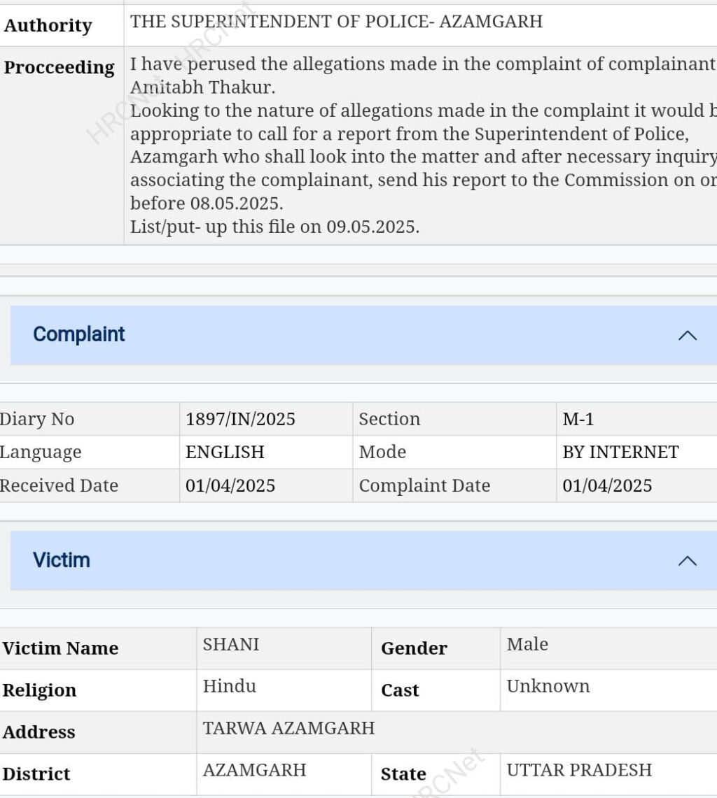 मानवाधिकार आयोग ने SSP आजमगढ़ को निर्देश दिया है कि वे इस मामले की व्यक्तिगत रूप से निगरानी करें और जांच प्रक्रिया में अमिताभ ठाकुर को शामिल करें। आयोग ने SSP को 8 मई तक अपनी आख्या प्रस्तुत करने का आदेश दिया है। इस मामले की अगली सुनवाई 9 मई 2025 को होगी।